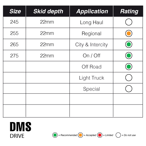 When the road leads off the beaten path, the DMS pattern is your trusted companion. Designed for on-off road directional drive axles, this tread thrives in severe off-road conditions. Expect excellent traction and the durability to withstand whatever challenge the environment throws your way. Diamond Tread DMS helps you conquer every terrain with confidence.