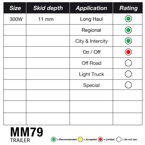 • Low rolling resistance, shallow tread and compound formulation generates less heat ensuring less fatigue